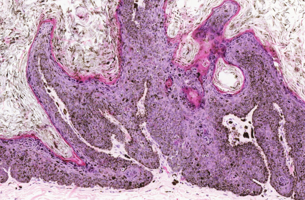 On gross examination, the lesion was well-demarcated, slightly elevated, firm, and ovoid, measuring 1.1 cm in diameter. It was dark brown to black with a rough papillomatous surface. There was no ulceration, erythema, or exudate.