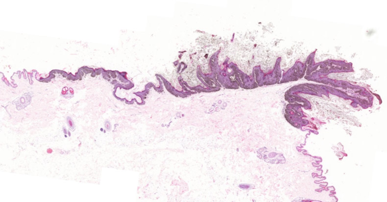 Microscopic examination of haired skin sections revealed a well-demarcated area of marked papillomatous epidermal hyperplasia and moderate hyperkeratosis, consisting of both orthokeratotic and parakeratotic forms. The epidermis showed hypergranulosis with enlarged keratohyalin granules, and keratinocytes exhibited koilocytosis with swollen pale cytoplasm and perinuclear clearing. There was prominent melanin deposition within all epidermal layers and a few melanophages in the superficial dermis. The underlying dermis contained minimal perivascular lymphoplasmacytic infiltrate without significant fibroplasia, ulceration, or other abnormalities.
