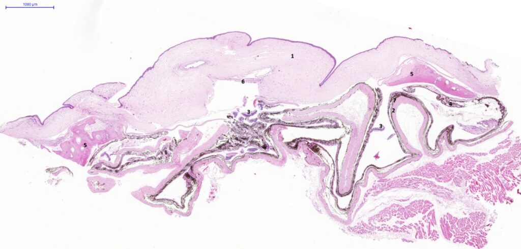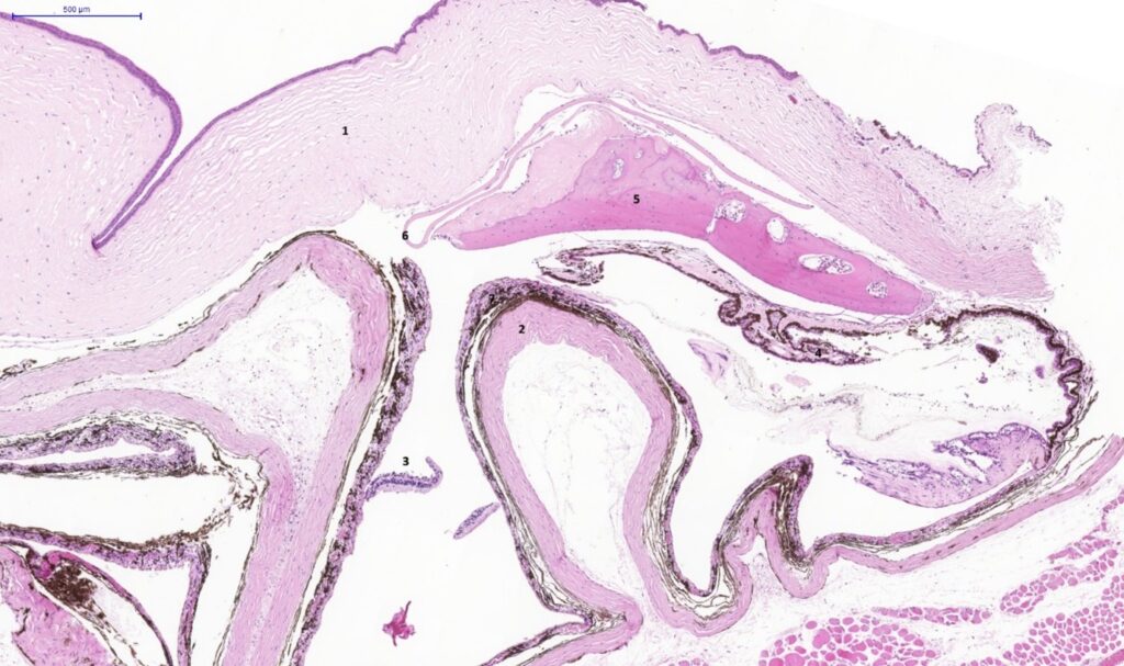 Fig. 1. Eye, guinea pig. Section of a collapsed eyeball. 1. Cornea; 2. Sclera; 3. Detached retina; 4. Ciliary processes; 5. Heterotopic bone formation; 6. Fragment of lens capsule; 7. Choroid. H&E stain. Scale bar = 1000 µm.