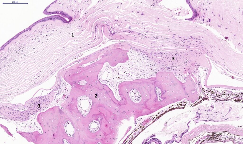 Fig. 3. Eye, guinea pig. Section of a collapsed eyeball. 1. Cornea; 2. Heterotopic bone formation; 3. fibrous connective tissue. H&E stain. Scale bar = 200 µm.