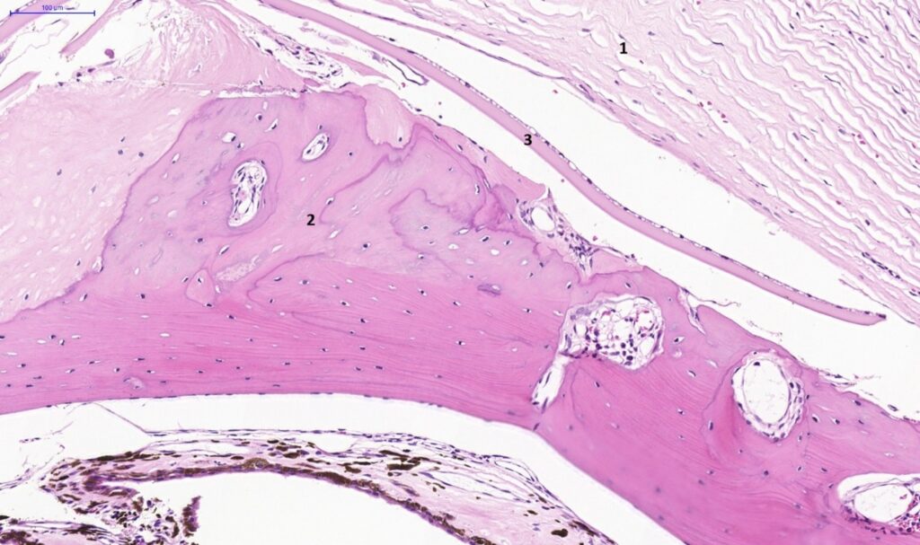 Fig. 4. Eye, guinea pig. Section of a collapsed eyeball. 1. Cornea; 2. Heterotopic bone formation; 3. Fragment of lens capsule. H&E stain. Scale bar = 100 µm.