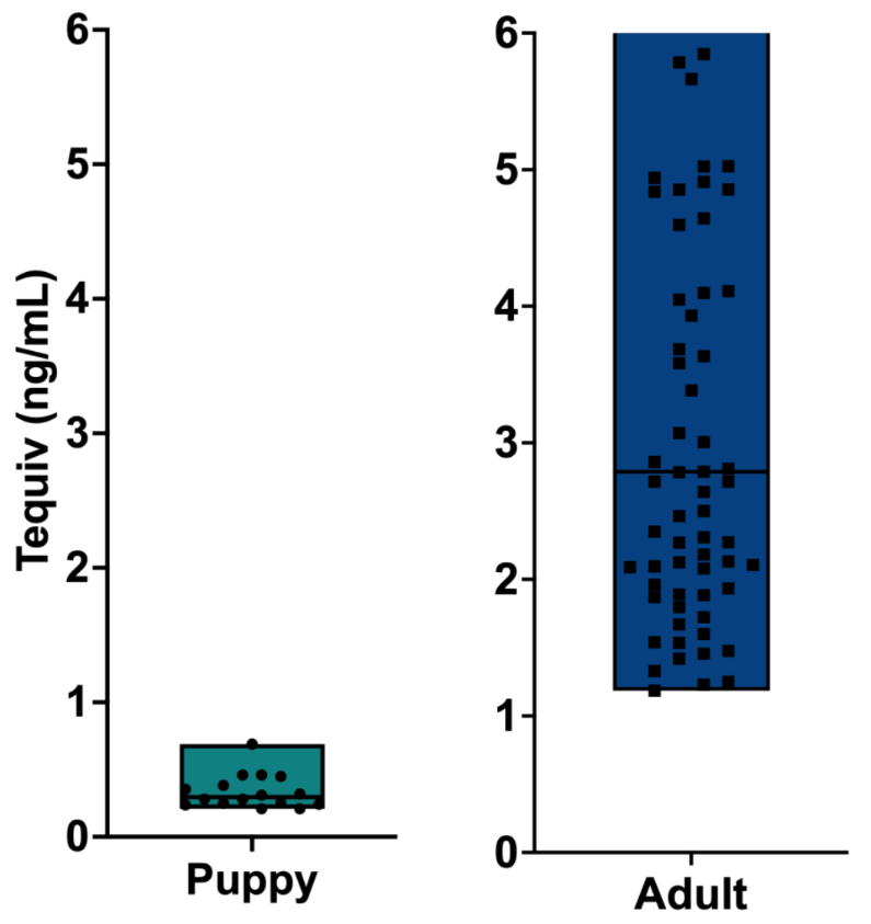 Figure 1. Bioactivity, as testosterone equivalent (Tequiv), of male puppies and adult intact male dogs, including small and large breeds.
